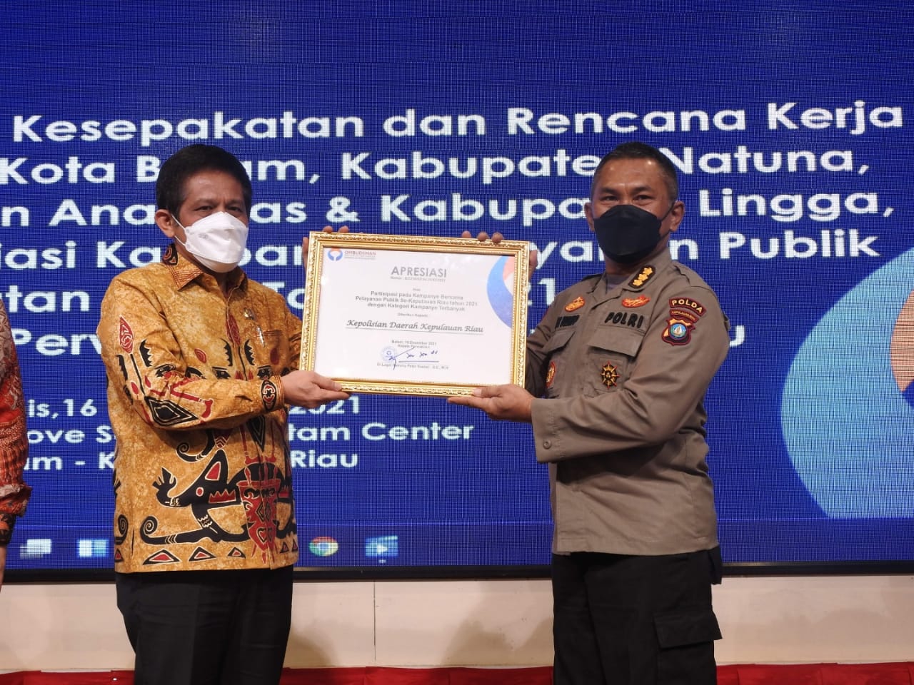 BatamTintamedikerpri.id. – Ombudsman Republik Indonesia perwakilan Kepulauan Riau memberikan Apresiasi atas Partisipasi pada Kampanye bersama Pelayanan Publik Se-Kepulauan Riau Tahun 2021 pada Polda Kepulauan Riau, dalam kesempatan tersebut Polda Kepri meraih dua Apresiasi dengan Kategori Kampanye paling kreatif dan kampanye terbanyak, kegiatan tersebut dihadiri oleh Gubernur Kepulauan Riau. H. Ansar Ahmad, SE, MM, Irwasda Polda Kepri diwakilkan oleh Auditor Madya TK. III Itwasda Polda Kepri Kombes Pol Eko Budhi Purwono, S.Ik, dan para Walikota serta Bupati Se-Provinsi Kepri. Bertempat di Ballroom Love Seafood, Batam Center, Kota Batam. Kamis, (16/12/2021).