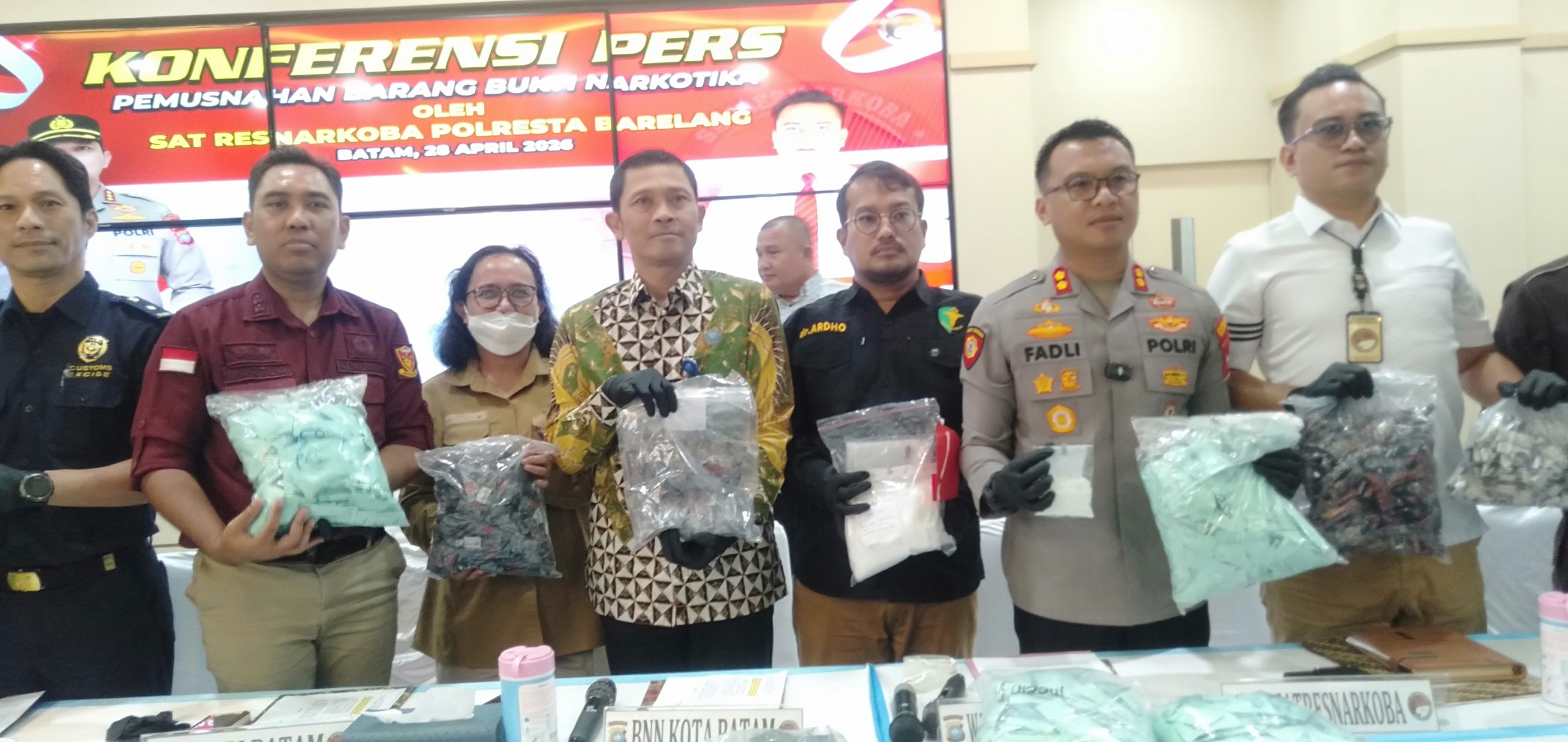 Batam,Tintamediakepri.id. Polresta Barelang menggelar konferensi pers yang dirangkaikan dengan pemusnahan barang bukti narkotika hasil pengungkapan kasus penyalahgunaan narkoba di wilayah hukumnya. Kegiatan ini berlangsung di lobi Mapolresta Barelang pada Selasa (28/4/2026) sebagai bentuk keterbukaan kepada publik atas kinerja kepolisian dalam periode Februari hingga April 2026.